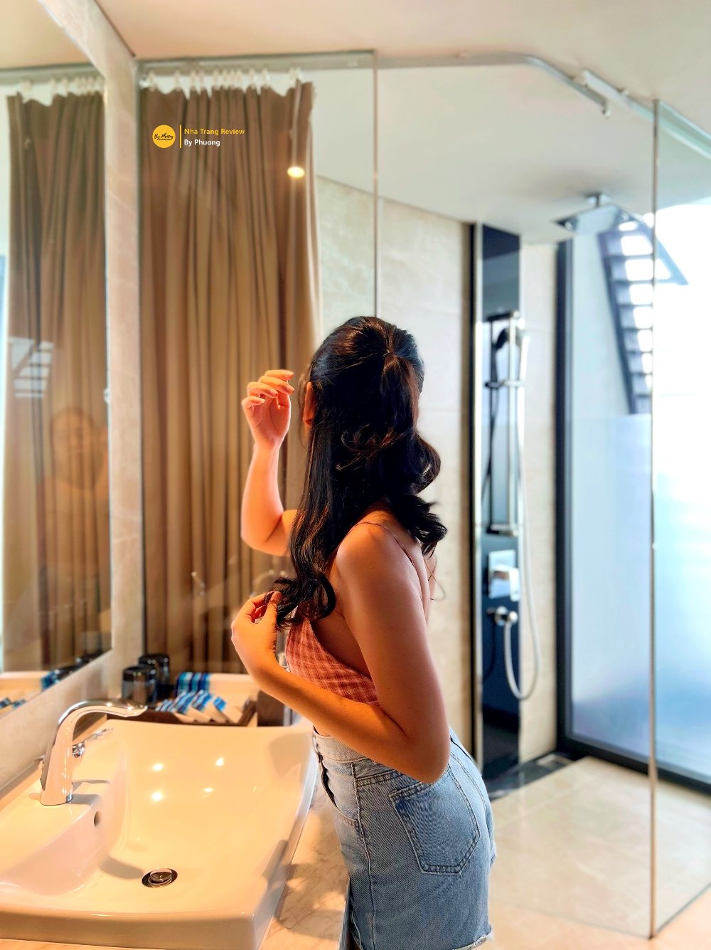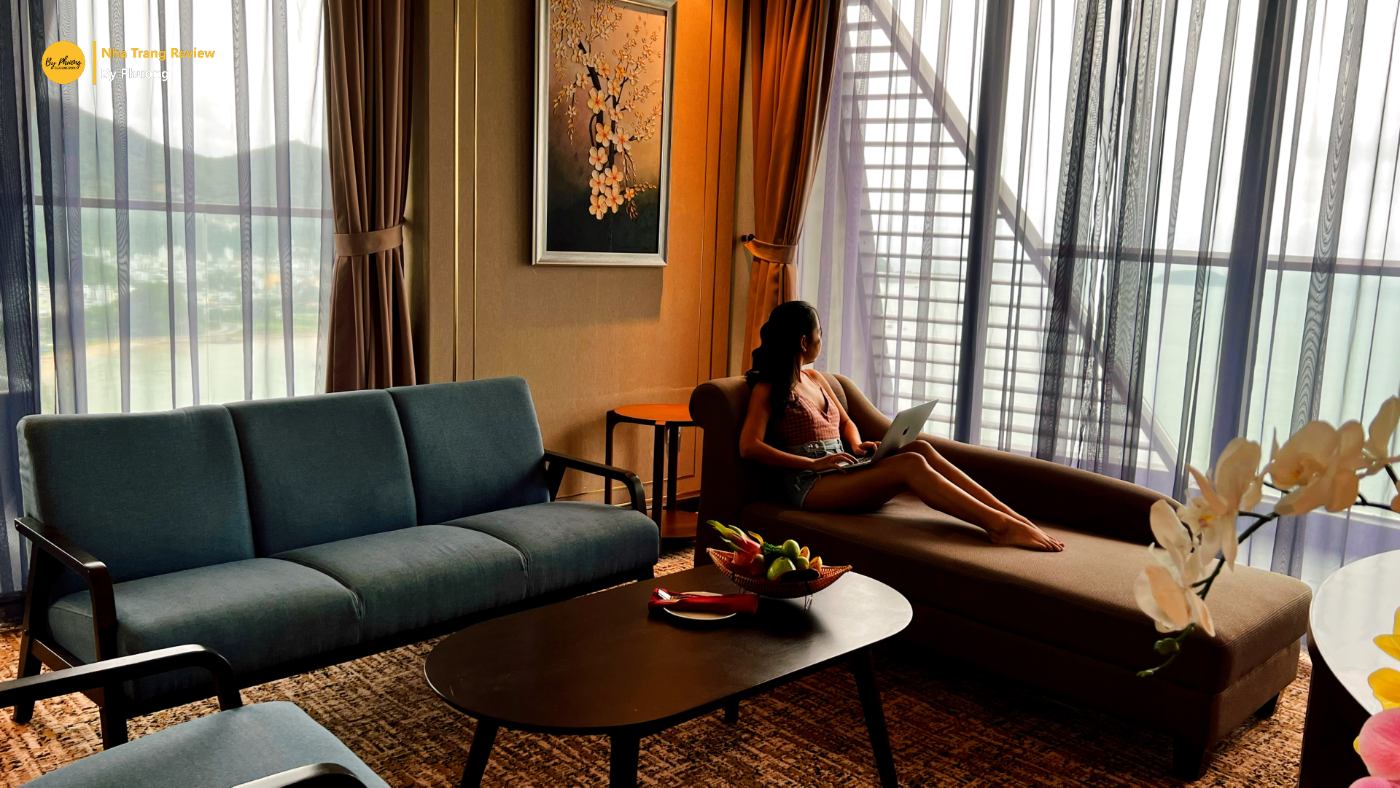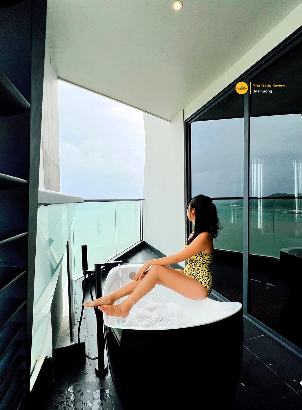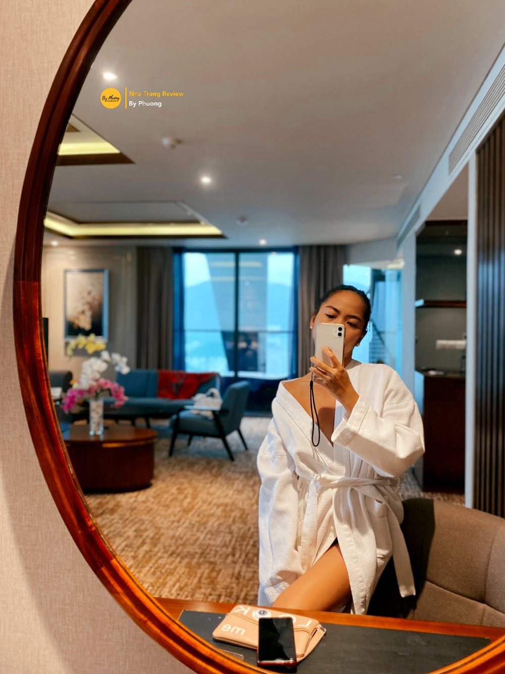 Phòng Phương lưu trú lần này là phòng Suite (2510) nằm ở tầng cao nhất của tòa nhà. Điểm nổi trội của hạng phòng này là diện tích lên đến 80m2 với giường đôi cực lớn, ban công riêng, sàn lót thảm, buồng tắm đứng và cả bồn tắm lộ thiên view biển. Ngoài ra các dịch vụ đi kèm còn có nước uống đóng chai, welcome fruit, sử dụng phòng xông hơi cùng tất cả các tiện ích hiện có của khách sạn (gym, hồ bơi vô cực, bãi biển riêng…).