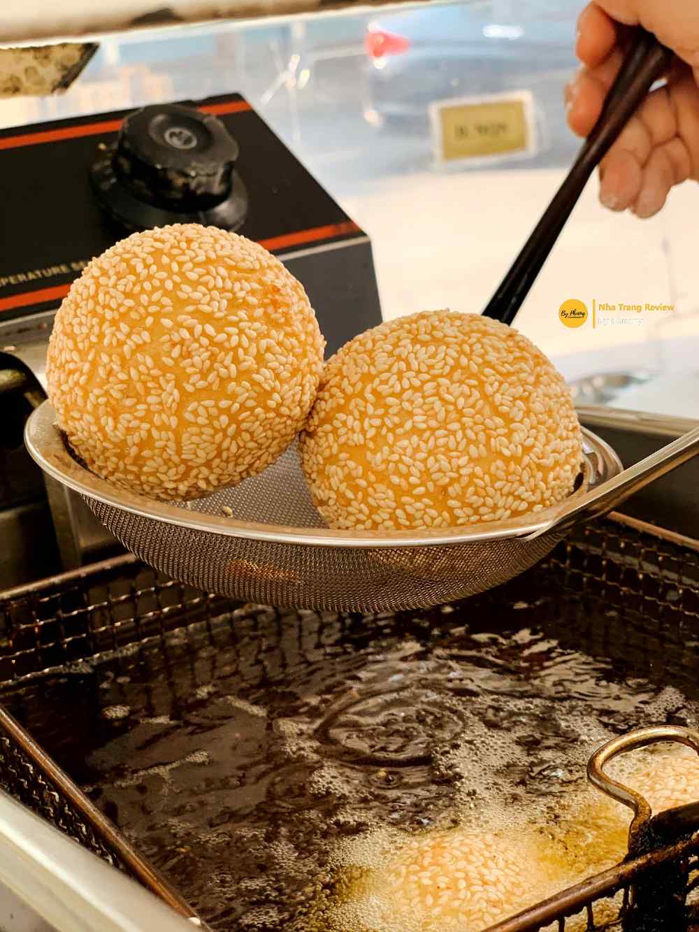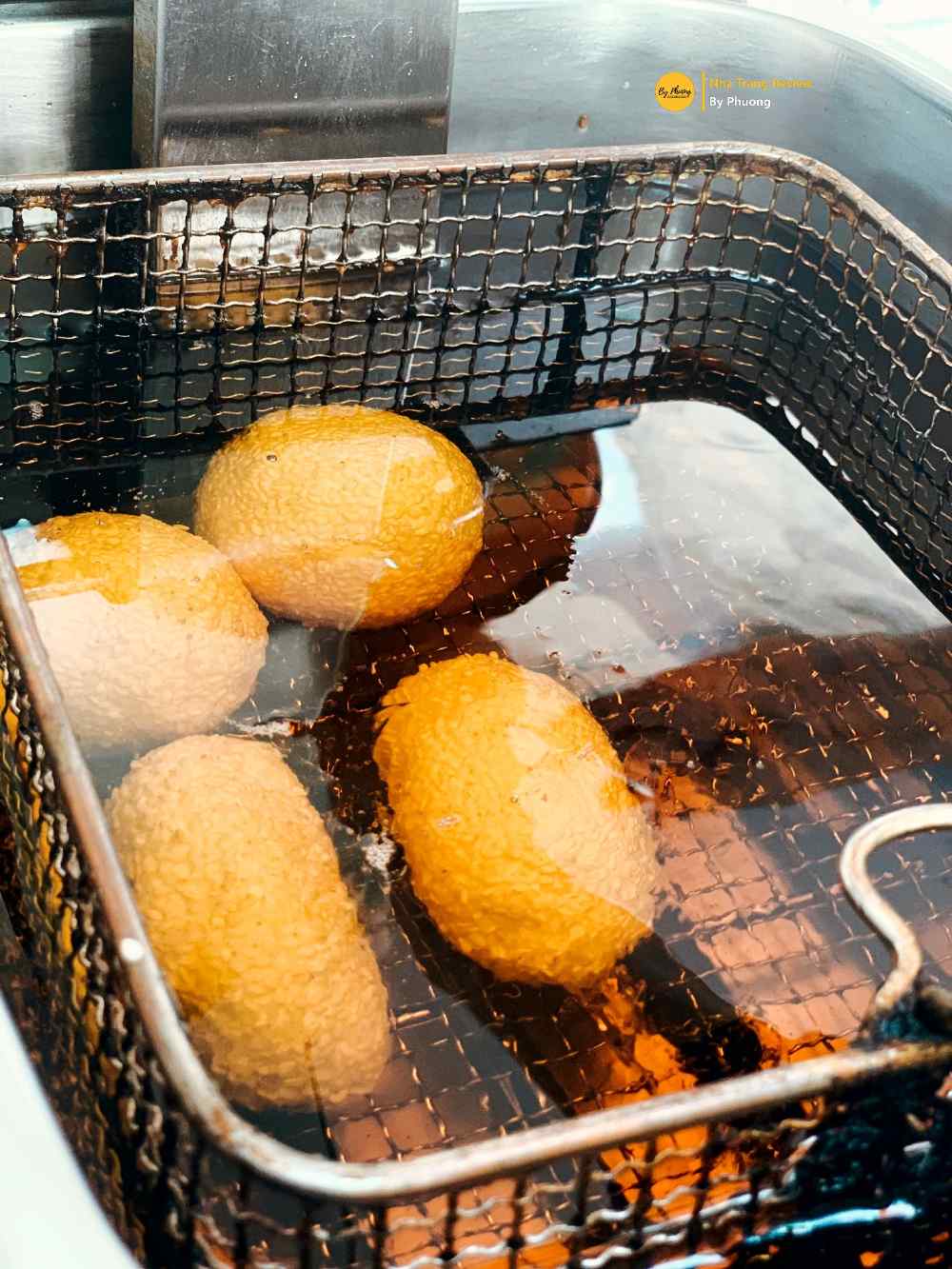 Cái bánh cam tròn quay, vàng óng đầy mời gọi. Dùng tay bẻ đôi mới thấy hết cái sự giòn. Bánh này khi khách mua mới bắt đầu chiên nên tới tay khách còn nóng hôi hổi. Giá giao động từ 10 đến 14 ngàn một cái. Quán mở từ tầm 2h chiều đến tối, nhìn cái booth bánh cam mắc cười lắm, tự ghi trên đó là “bánh cam thần thánh”, thấy ghê hôn 😛