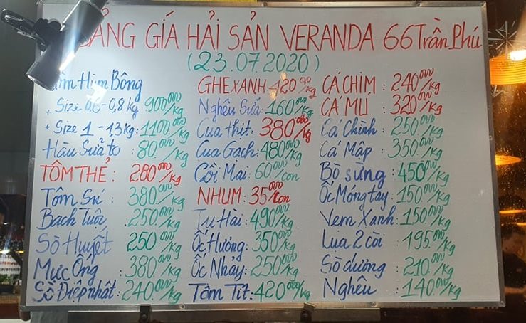 Hải sản Veranda nằm tại địa chỉ 66 Trần Phú – một địa điểm thuộc dạng trung tâm của trung tâm. Khu 66 Trần Phú này có vài quán hải sản liền kề nhau nhưng Veranda là quán có diện tích khủng nhất. Tông màu chủ đạo của nhà hàng là tông vàng, các bạn có ghé thì nhớ vào đúng quán nha.