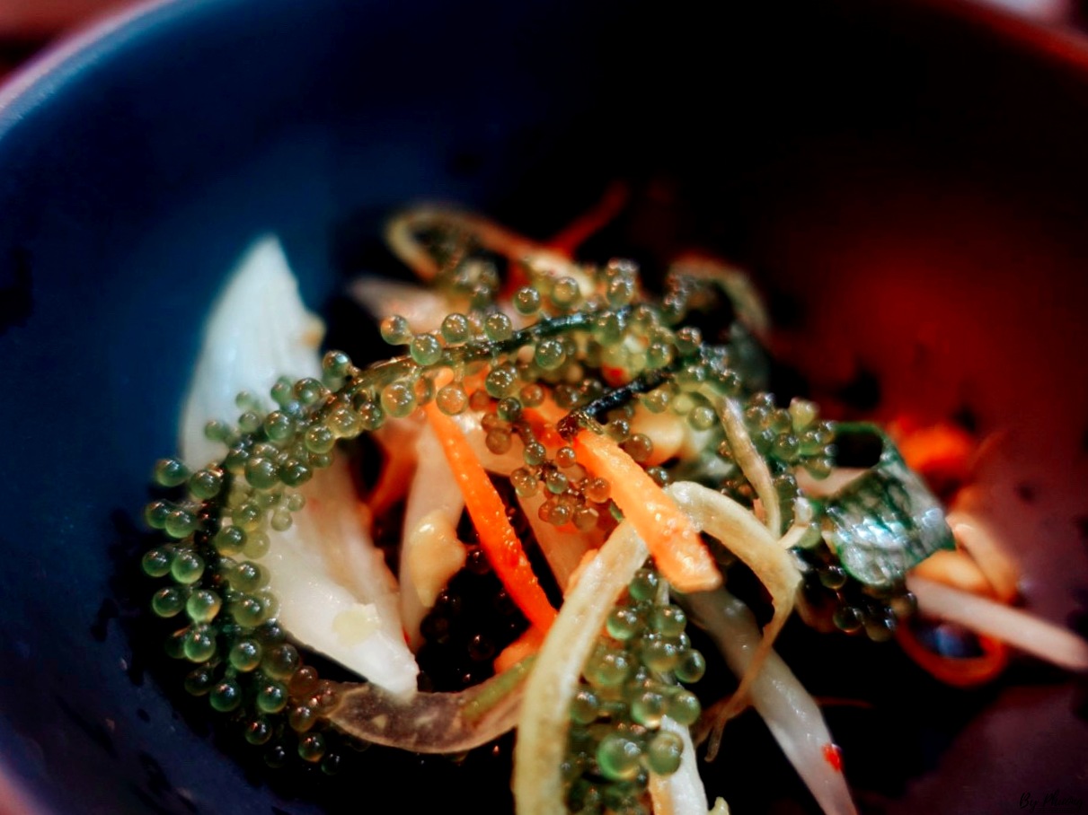 Một dĩa gỏi rong nho như này không có thịt thà gì hết, chỉ có rong nho, cà rốt bào sợi, bắp chuối (hoa chuối), hành tây, rau thơm và đậu phộng rang thôi. Nước trộn là kiểu chua ngọt. Lúc mới nhìn thấy không ấn tượng mấy, nhấp thử cọng rong nho thấy mặn quá tính chê, vậy mà trộn đều lên xong gắp gắp hết dĩa hồi nào không hay 😈 Khi ăn các “hạt nho” vỡ ra cảm giác y chang như ăn trứng cá hồi vậy đó.