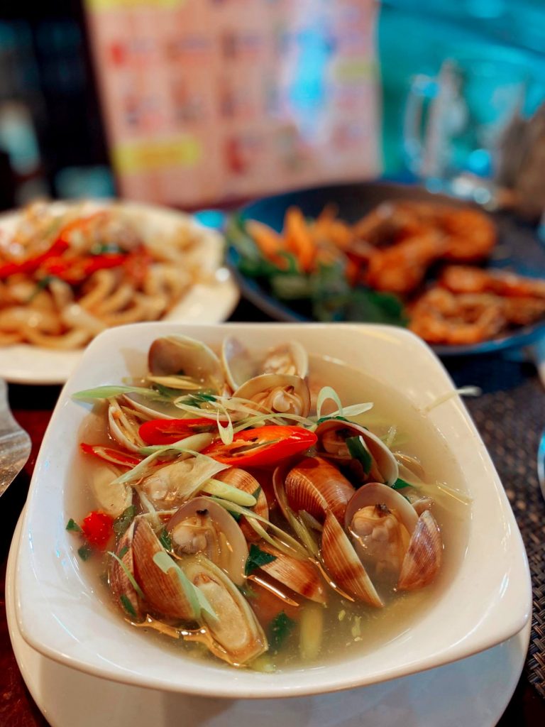 Bên này có trữ lượng hải sản nuôi tại hồ cực nhiều và có kha khá các loại nghêu sò. Từ sò lụa, sò dương, sò chén, nghêu hai còi, nghêu sữa… đều có đủ. Bữa đó P gọi hẳn 1kg nghêu hai còi hấp Thái, ta nói ăn mỏi mỏ!