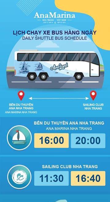 Trong trường hợp nếu không tự túc phương tiện đi lại được thì có thể sử dụng xe đưa đón miễn phí của Ana Marina từ Sailing Club Nha Trang (72 – 74 Trần Phú) theo lịch trình như hình bên.