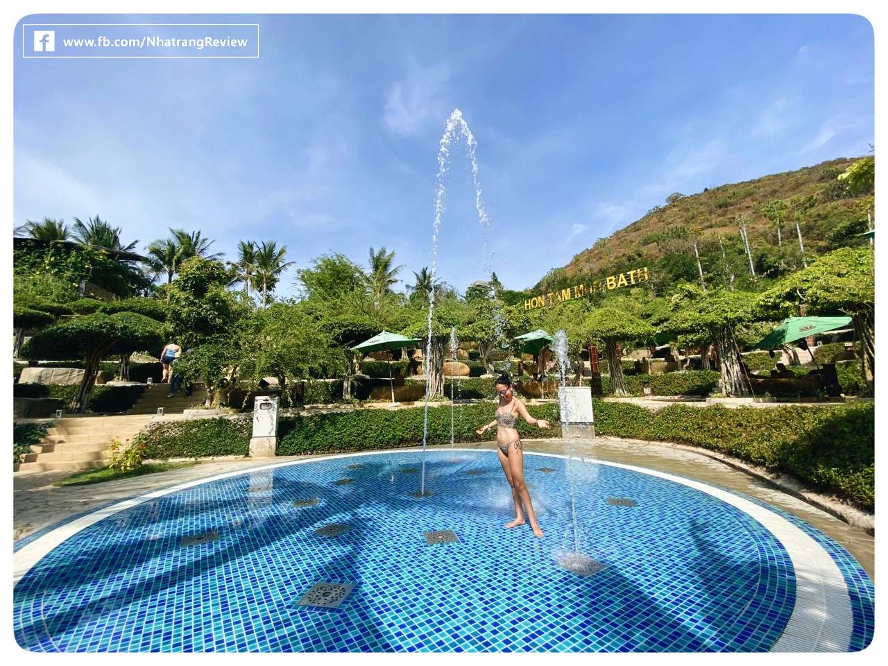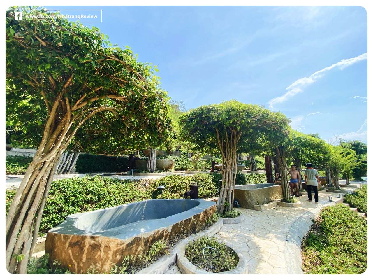 Sau khi cất đồ/ thay đồ thì đầu tiên chúng ta sẽ ra tắm bùn. Khu tắm bùn có nhiều loại bồn gồm bồn đôi, bồn gia đình, bồn nhóm, bồn tập thể, ai thích cái nào thì dùng cái đó hén. Hệ thống bồn của Hòn Tằm được xây theo hình bậc thang xen kẽ với cây xanh, sát bên mỗi bồn là vòi tắm tráng. Liệu trình ngâm bùn cơ bản như này kéo dài 20 phút. Khi bước vào bồn các bạn nhớ cẩn thận vì bùn đọng dưới đáy hồ sẽ khá trơn. Khi ngâm nên kèm một chai nước nhỏ bên cạnh vì ngâm bùn nóng có thể khiến cơ thể cảm thấy khát.