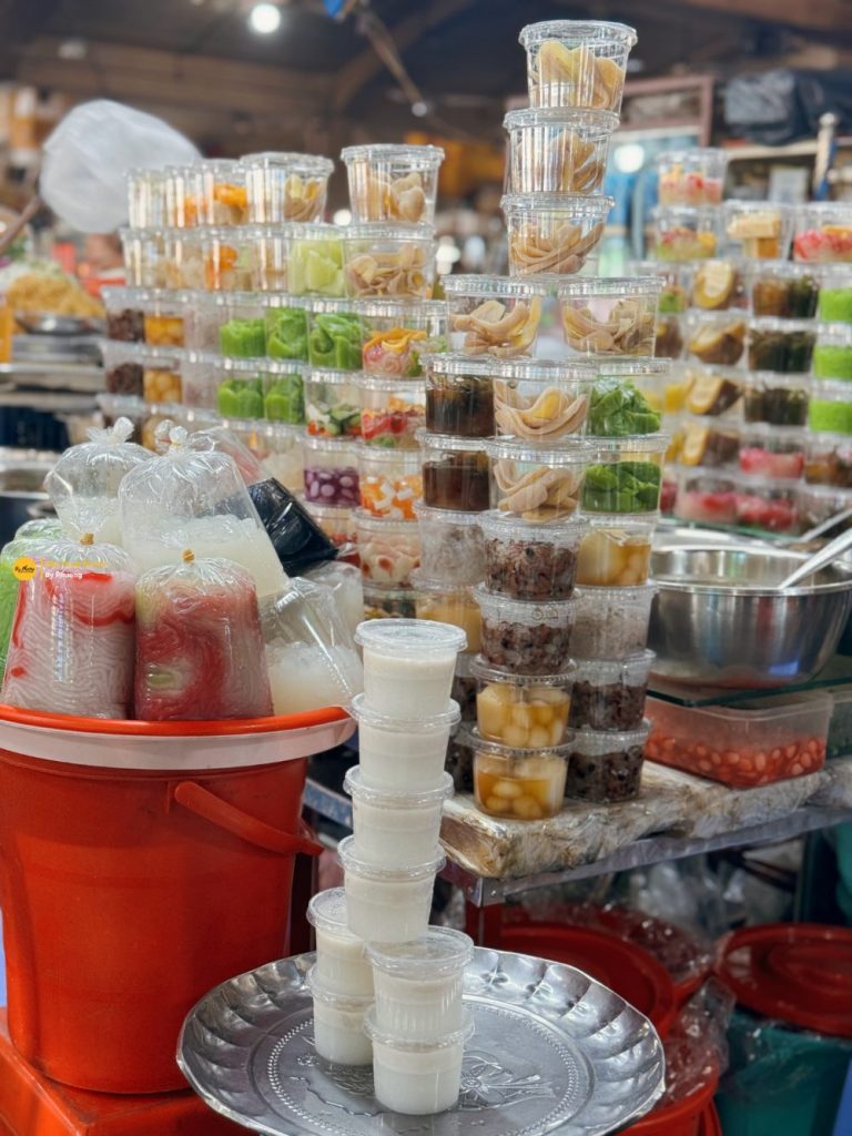 Chè: Trang trí quầy chè cứ gọi là thu hút. Nhìn xanh xanh đỏ đỏ, trẻ nhỏ hay người lớn gì cũng sẽ mê. Vậy nên mới có chuyện ăn xong tại chỗ còn mua thêm một bịch mang về khách sạn chén. Mà chè không chỉ có chè Cam mà còn có chè của Việt Nam, chè Thái nữa nghen. Phương thử chè Thái làm từ lòng đỏ trứng gà (ngon vãi đạn) và chè bí đỏ (bên trong có bánh plan). Cái chè bí đỏ hồi xưa ăn ở Kampot một lần rồi. Còn ở Việt Nam nghe nói chợ Hồ Thị Kỷ trong Sài Gòn bán nhiều lắm.