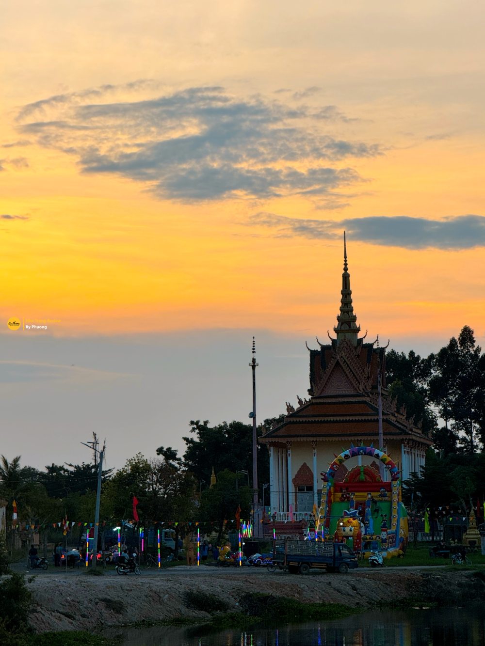 Sau mấy mươi phút cân não, cả đoàn dừng lại trên một con đường làng. Trước mặt là đồng ruộng và một ngôi đền nơi dân làng đang làm lễ gì đó. Tiếng nhạc lễ liên tục phát ra đều đều và mặt trời cũng dần xuống ngày một rực rỡ hơn. Anh guide lấy đâu ra mấy trái dừa bung, dùng một con dao nhọn khui cho mỗi người một trái. Thật đúng lúc.