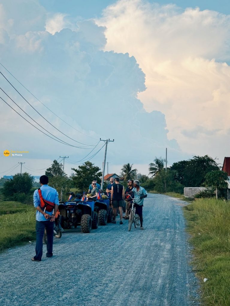 Tuy biết xe này độ cân bằng tốt, nhưng tâm lý rén thì vẫn rén vì con đường cả nhóm bắt đầu lái xe trên đó không phải đường bằng. Nó là một con đường làng với rất nhiều ở voi, ổ gà đầy những nước là nước. Và quan trọng là đường có xe của người dân lưu thông qua lại, ATV thì không có kính chiếu hậu, không quan sát được phía sau, dân Cam thì hầu như không xài còi. Nói chung là vừa lái vừa sợ tán phải ai đó thì ốm tiền đền. Sau mươi, mười lăm phút chạy như rùa bò thì mới dám tăng tốc lên xí đỉnh.